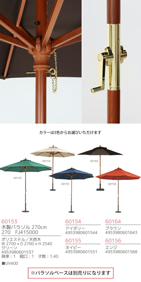 商品名木製パラソル 270cm 商品品番60153 60154 60155 60156 60164 カラーグリーン、アイボリー、ネイビー、エンジ、ブラウン 商品サイズ全体:幅2700×奥行2700×高さ2540mm、ポール径φ38mm 材質ポリエステル/天然木 商品重量8kg 梱包重量9kg その他組立式 注意事項※パラソル用ベースは別売りです。