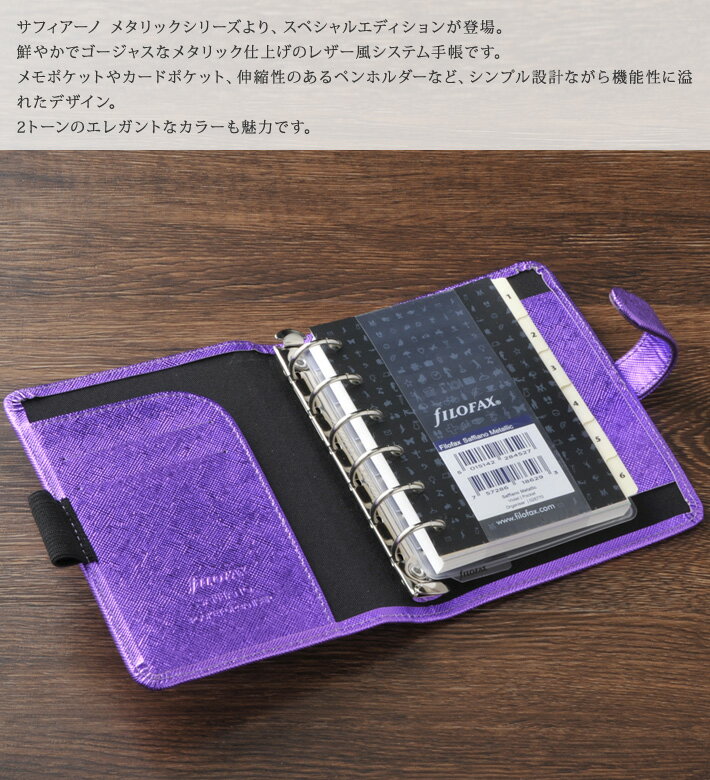ファイロファックス filofax サフィアーノ Saffiano メタリック Metallic ポケットサイズ スモールサイズ システム手帳 ビジネス ギフト プレゼント 贈り物 メンズ レディース カラー シルバー、バイオレット サイズ ポケットサイズ 実寸 W115mm×H145mm×D34mm リング内径:19mm 素材 レザー調 仕様 見開き右:メモパッドポケット×1 見開き左:カードポケット×2、スリップポケット×1、伸縮性ペンループ 商品説明 サフィアーノ メタリックシリーズより、スペシャルエディションが登場。